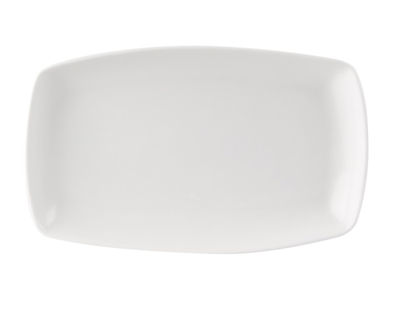 Rectangular Coupe Platter 32cm x 19.5cm. Multi-purpose serving platter with sloping, angled edges in plain white china, suitable for table, canape or buffet service.